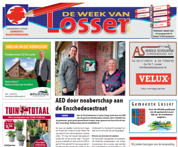 Naast de papieren editie is de krant ook online terug te lezen via verschillende platforms en sociale media. Hierdoor blijft de inhoud langer beschikbaar en wordt het lokale bereik verder versterkt. Voor ondernemers die hun doelgroep in en rond Losser willen bereiken, biedt adverteren in De Week van Losser een directe en effectieve manier om zichtbaar te zijn. Door lokaal te adverteren bouw je stap voor stap aan bekendheid, vertrouwen en nieuwe klanten in je eigen regio. Een advertentie, eenmalig of een reeks, regel je bovendien heel eenvoudig via de advertentiemodule op ons platform. Je hebt direct inzicht in de plaatsingsdatum en kosten.