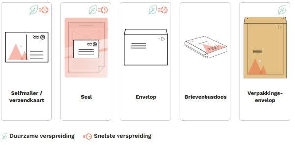 Belangrijk is verder dat we de gebruikerservaring van ons verspreidplatform verbeteren. Bij elk product dat je selecteert, zie je voortaan direct een afbeelding. Zo weet je steeds precies waarvoor je kiest. Daarnaast zijn voor alle producten de aanleverspecificaties zichtbaar, inclusief een duidelijk instructiebestand én een handig werkbestand. Niet meer zoeken dus, je vindt alles eenvoudig op de juiste plek. Deze verbeteringen gelden niet alleen voor de direct mail-module, maar voor al modules op ons platform.